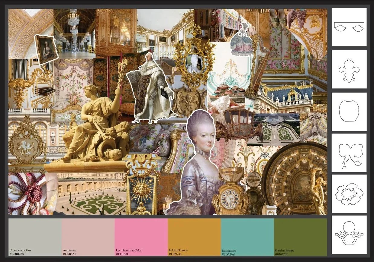 I selected Versailles, France as my inspiration, focusing on its opulence, symmetry, and historical detailing. I created a concept/mood board that explored architecture, gardens, ornamentation, and color palettes associated with the palace and its surroundings.